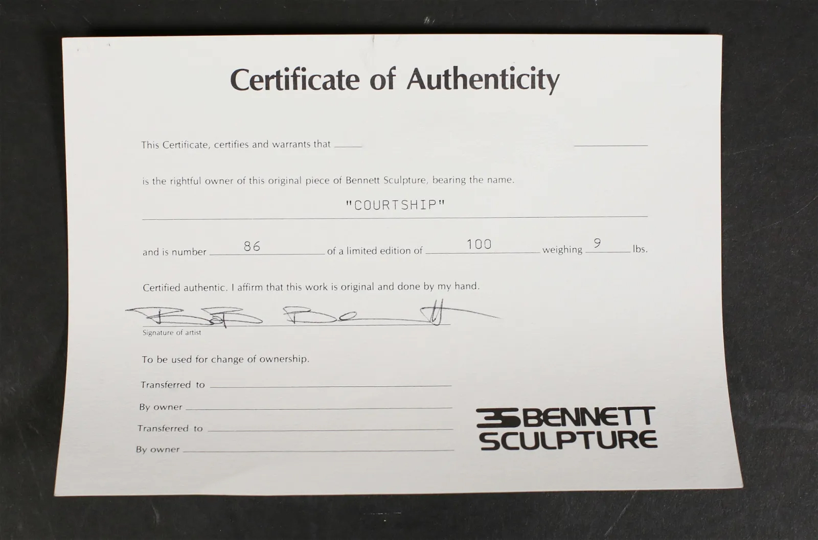 This specific work is part of the strictly limited B-100 edition, making it a more exclusive find than his later, larger editions. Weighing a substantial 9 pounds, the sculpture features a sophisticated interplay of high-polished bronze highlights against a deep, hand-applied patina. Authenticated by an original COA signed by the artist, this is an investment-grade example of 1980s American Modernism.