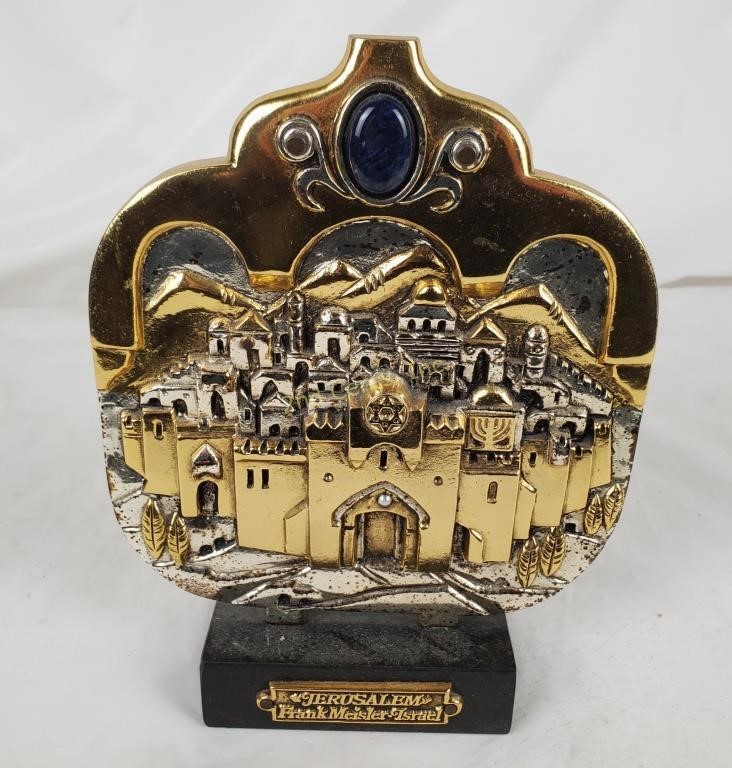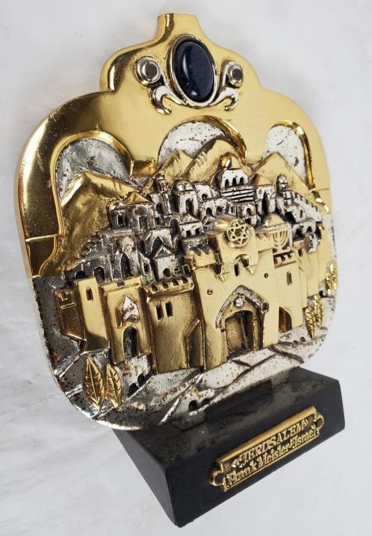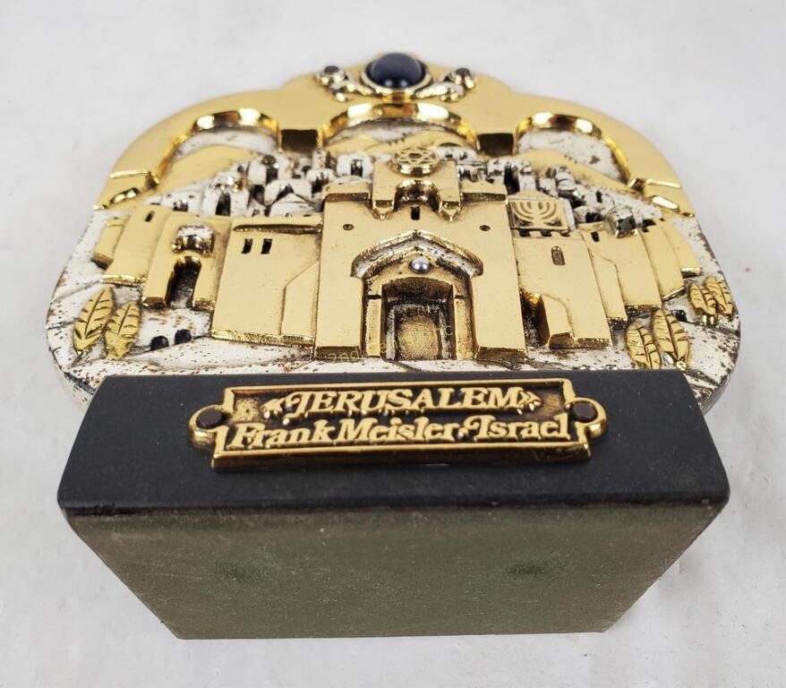 Americal Eclectic is proud to present a masterful tribute to the Holy City: the “Jerusalem Plaque” by world-renowned Israeli sculptor Frank Meisler (1925–2018). This limited-edition three-dimensional relief is a triumph of architectural artistry, meticulously handcrafted from metal alloys and layered with 925 silver and 24k gold plating.
