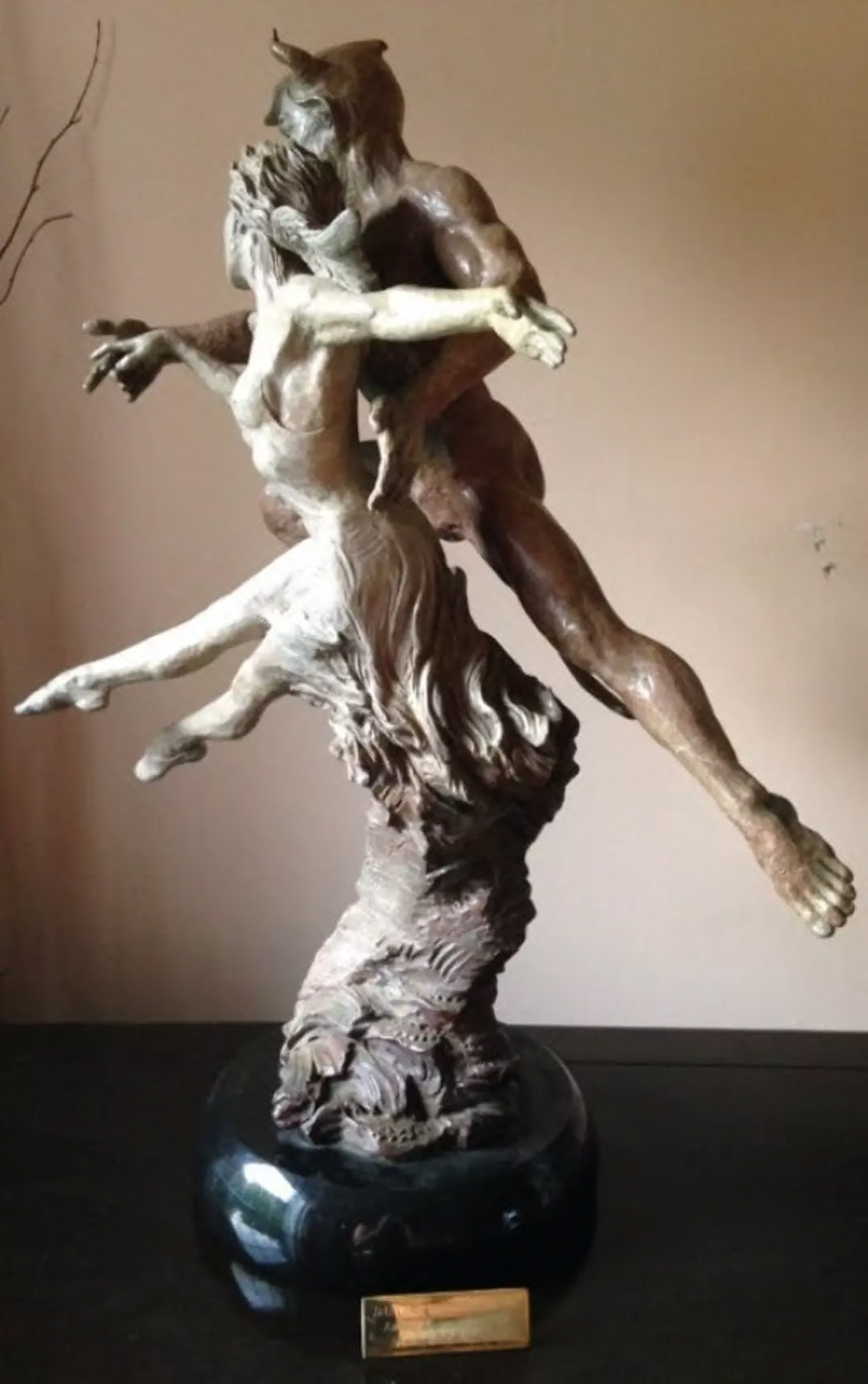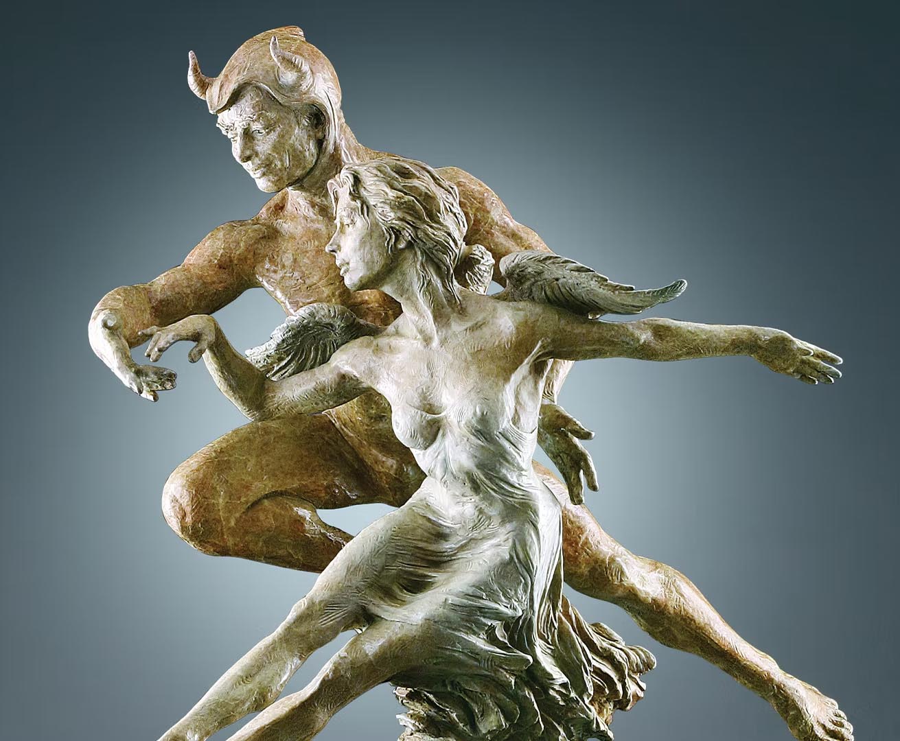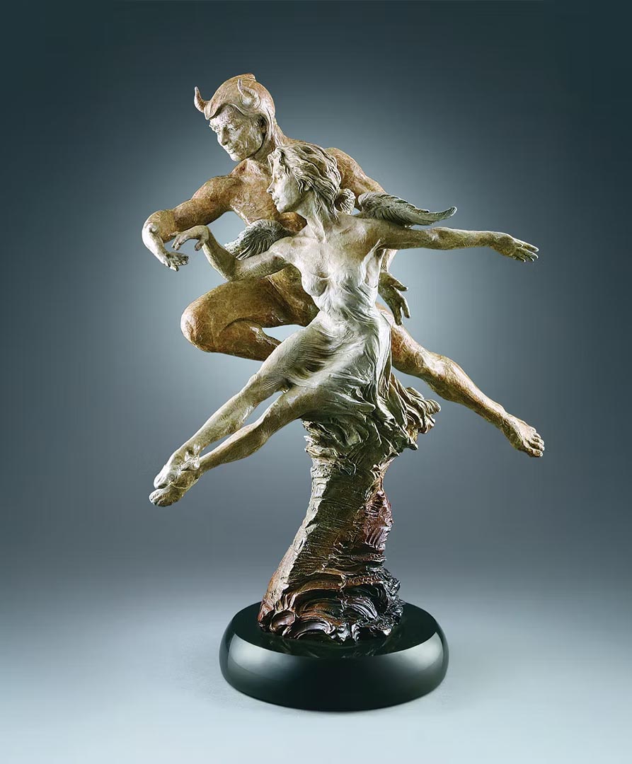 Eichinger is renowned for his ability to translate complex human emotions and narratives into the rigid medium of bronze. In this piece, the interplay between the figures suggests a story of protection, pursuit, or a synchronized journey through the ether. The male figure, characterized by satyr-like horns, exudes a protective and powerful energy as he orbits the ethereal female figure, whose dress flows with a kinetic energy that defies the weight of the cast metal.