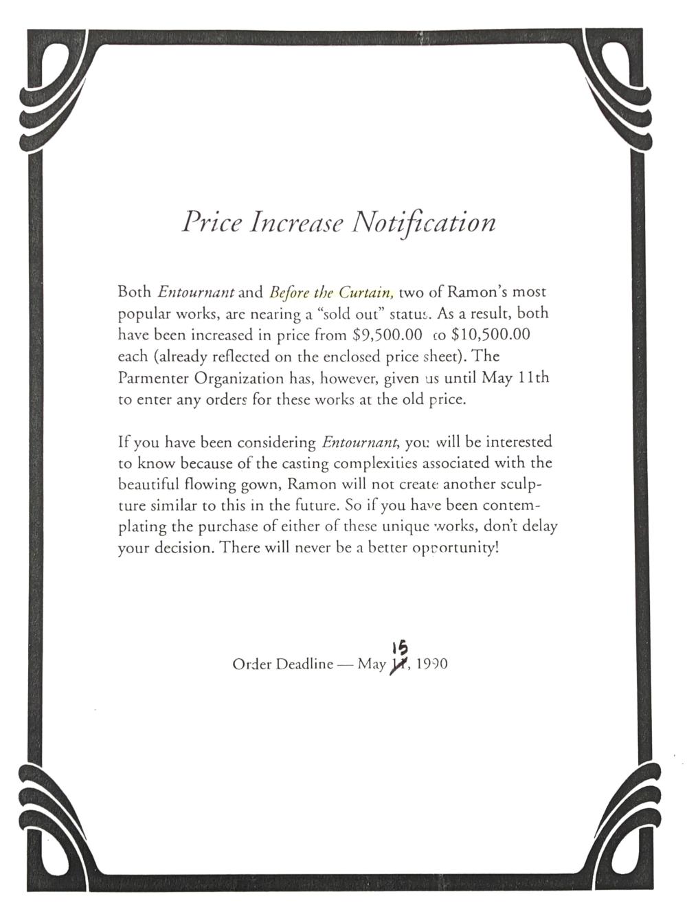 Most significant is the original 1988 gallery letter documenting the rapid rise in Parmenter’s valuation. This document proves that within months of its release, the demand for “Before The Curtain” was so intense that the retail price was formally increased—a testament to Parmenter’s explosive success following his selection as an official Olympic sculptor.