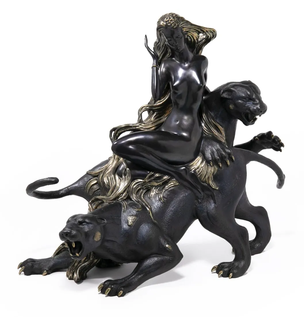 This specific casting is a rare find for the serious collector, bearing the prestigious low edition number 14 of 225. The work showcases Jiang’s revolutionary “Yunnan School” aesthetic—a vibrant fusion of Buddhist cave-painting traditions and modern abstraction. The panthers, symbols of power and grandeur, are rendered with a muscular fluidity that contrasts beautifully with the serene, gilded figure of the “Ghost.” Richly patinated in tones of emerald and charcoal with hand-applied gold highlights, this piece serves as both a cultural artifact and a pinnacle of late 20th-century sculpture.