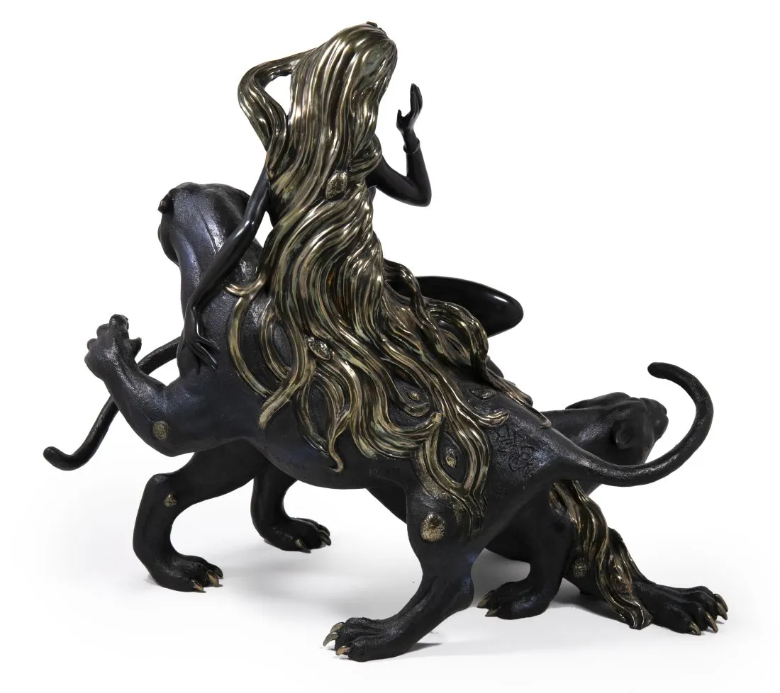 Americal Eclectic is honored to present one of the most mythologically significant works by Tiefeng Jiang: the 1989 bronze masterwork, “Mountain Ghost.” Inspired by the classical Chinese poetry of the Warring States period, this sculpture depicts the elusive female spirit of the mountains, poised with a signature Yunnan-style grace atop two powerful, guardian panthers.